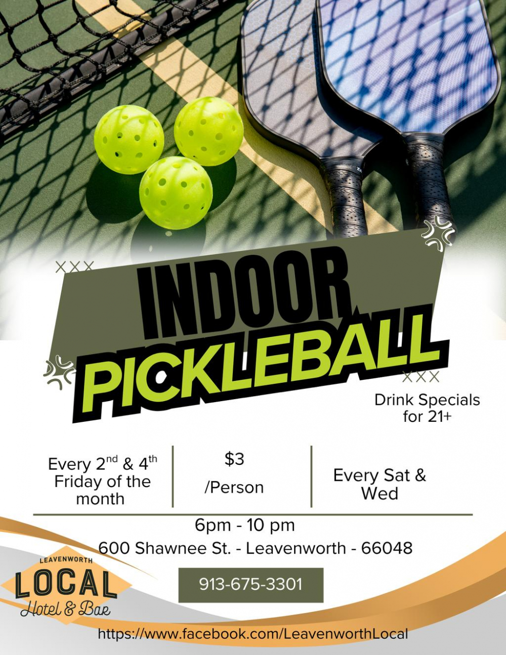 Call 913-675-3301 for details or visit us on Facebook: facebook.com/LeavenworthLocal. Tag your pickleball crew and make it a night!